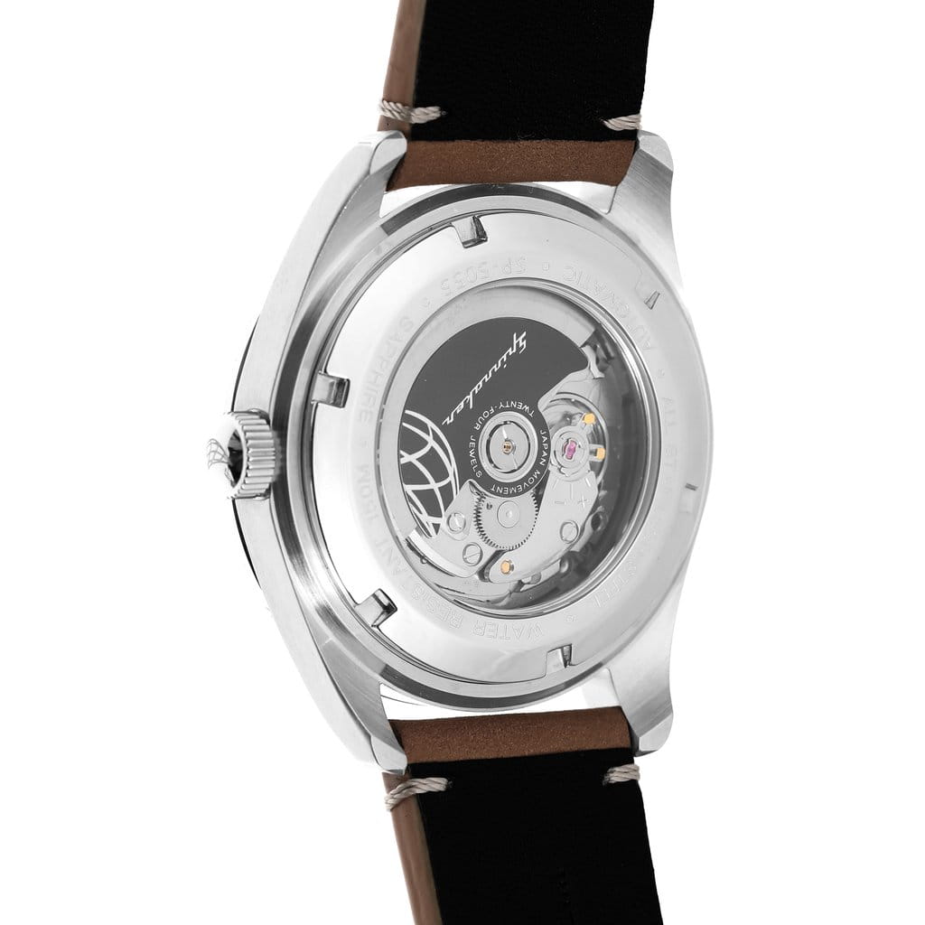Zegarek SPINNAKER SP-5055-01 - czasomierz męski pochodzący z kolekcji Fleuss. Koperta modelu została wykonana ze stali szlachetnej i zawieszona na brązowym, skórzanym pasku. Na czarnej tarczy umieszczono oznaczenia godzin w postaci indeksów liniowych i cyfr arabskich, wskazówki, a także datownik wskazujący dzień miesiąca. Cyferblat chroniony jest przez szkło szafirowe, które cechuje się wysoką odpornością na zarysowania. Zegarek SPINNAKER SP-5055-01 napędzany jest przez łożyskowany na 24 kamieniach mechanizm automatyczny TMI NH35. Wodoszczelność na poziomie 15 barów zapewnia ochronę podczas kontaktu z wodą, w modelu można pływać ale nie należy zanurzać się na znaczne głębokości.